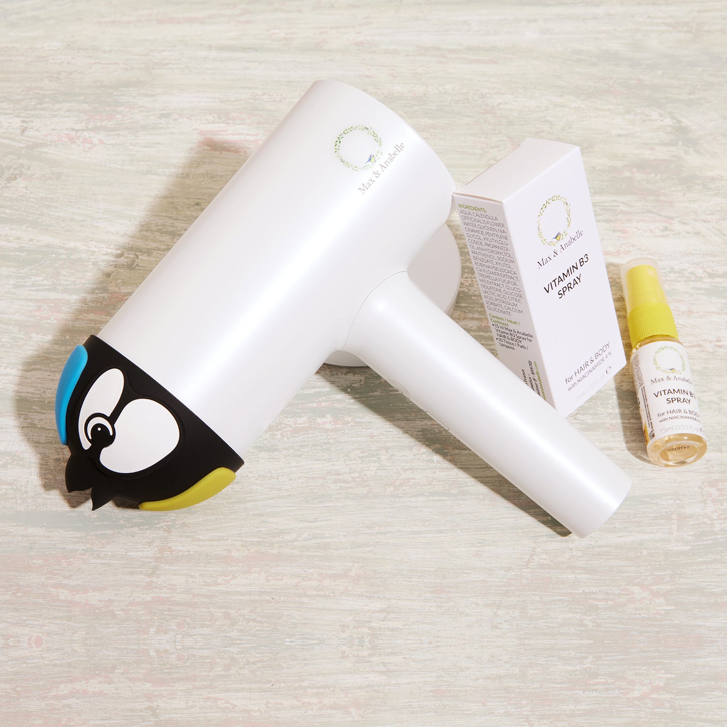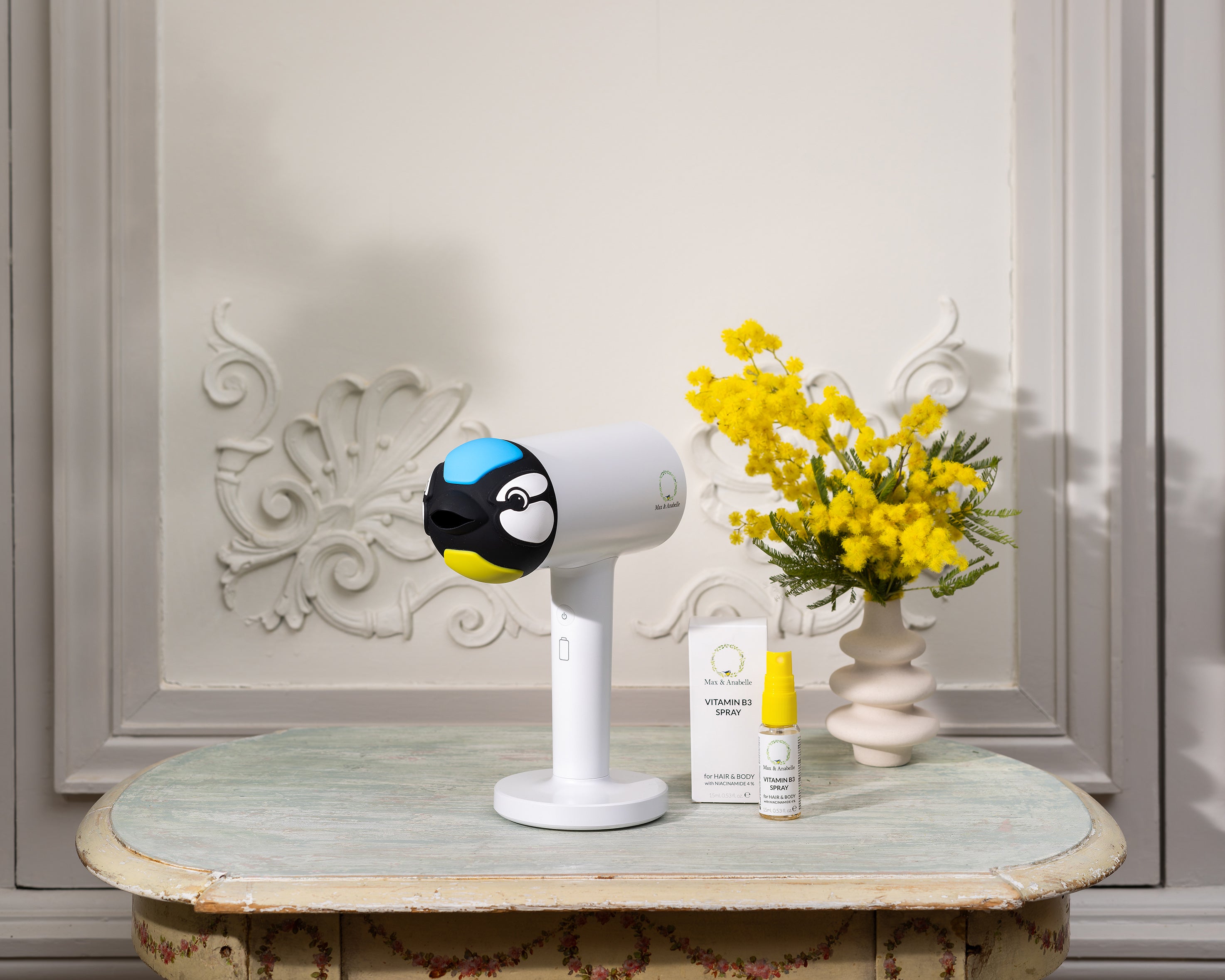 Grâce à l'infuseur situé à l'arrière du sèche-linge, l'air refroidissant le bébé est enrichi en vitamine B3. Cette vitamine, également appelée niacinamide, joue un rôle actif dans le maintien de la fonction normale de barrière cutanée ainsi que dans la réparation de la peau.