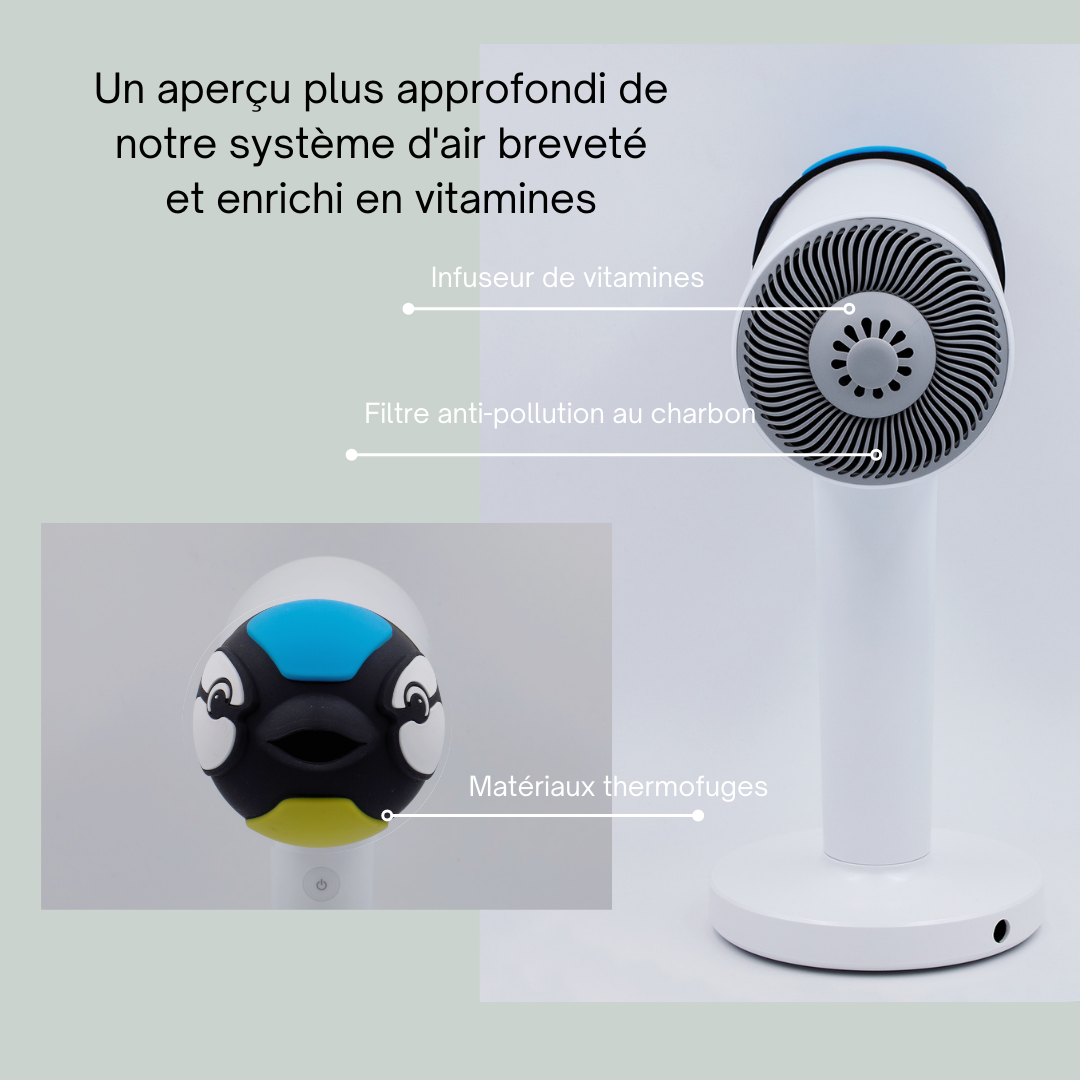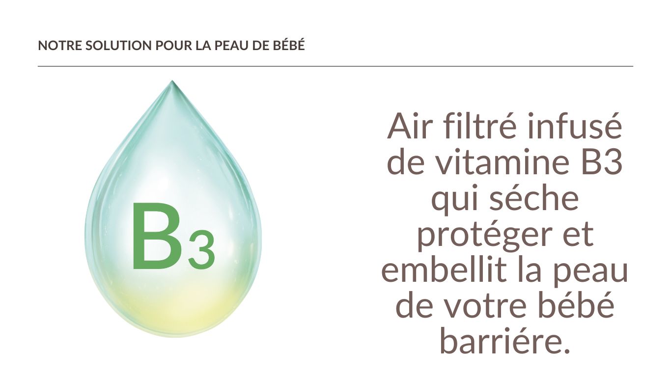 Air filtré infusé de vitamine B3 qui assèche, protège et renforce la barrière cutanée de votre bébé.